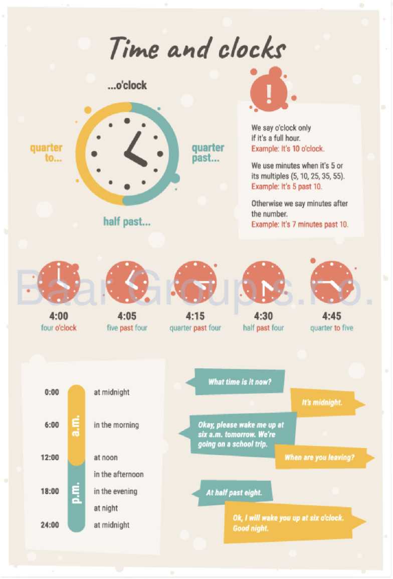 Skvělá učební pomůcka k zapamatování hodin a času v angličtině. Moderní infografika na výukovém panelu přehledně zpracovává témata angličtiny.