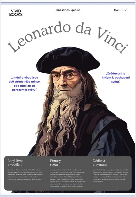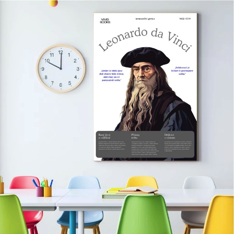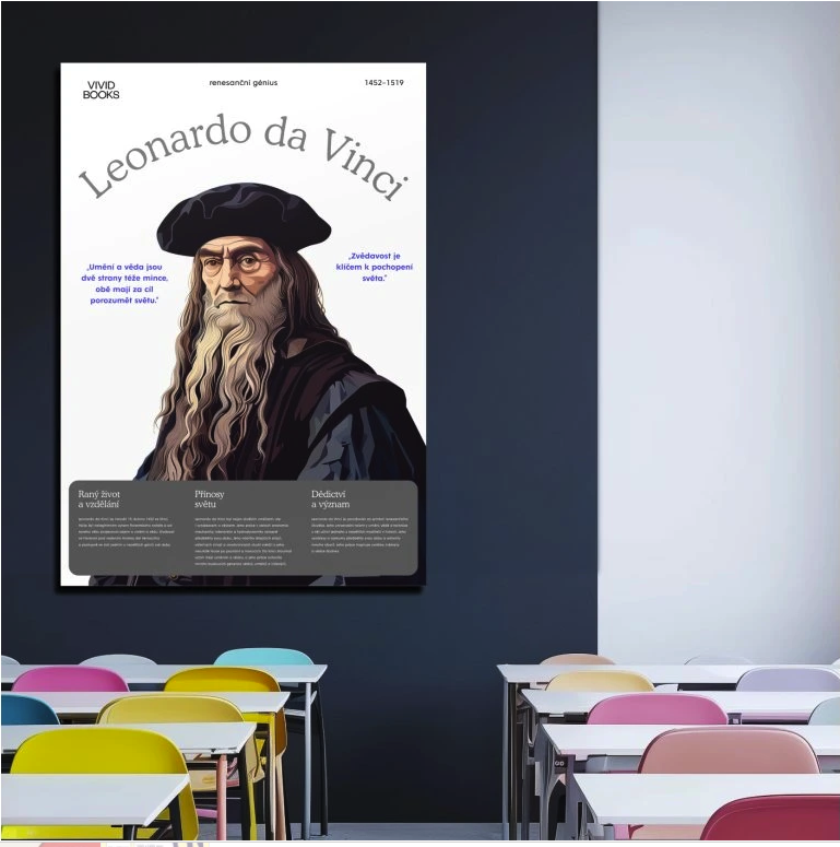 Plakát zachycuje renesančního génia Leonarda da Vinciho, jehož všestranné schopnosti v umění, vědě a technice změnily svět. Leonardo byl inovátorem, jehož objevy a díla předběhly svou dobu a inspirovaly generace v oblastech anatomie, mechaniky, malířství a inženýrství. Jeho zvědavost a touha po poznání zůstávají symbolem neomezených lidských možností a hlubokého porozumění světu kolem nás.