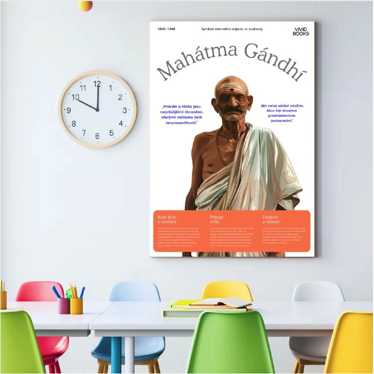 Tento plakát zachycuje Mahatmu Gandhiho, symbol mírového odporu a bojovníka za spravedlnost. Gandhiho filozofie nenásilí a jeho neochvějná víra v sílu pravdy a lásky inspirovaly miliony lidí po celém světě. Jeho odkaz zůstává živý jako připomínka, že změny lze dosáhnout soucitem, odhodláním a mírovým přístupem.