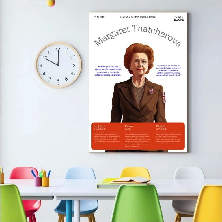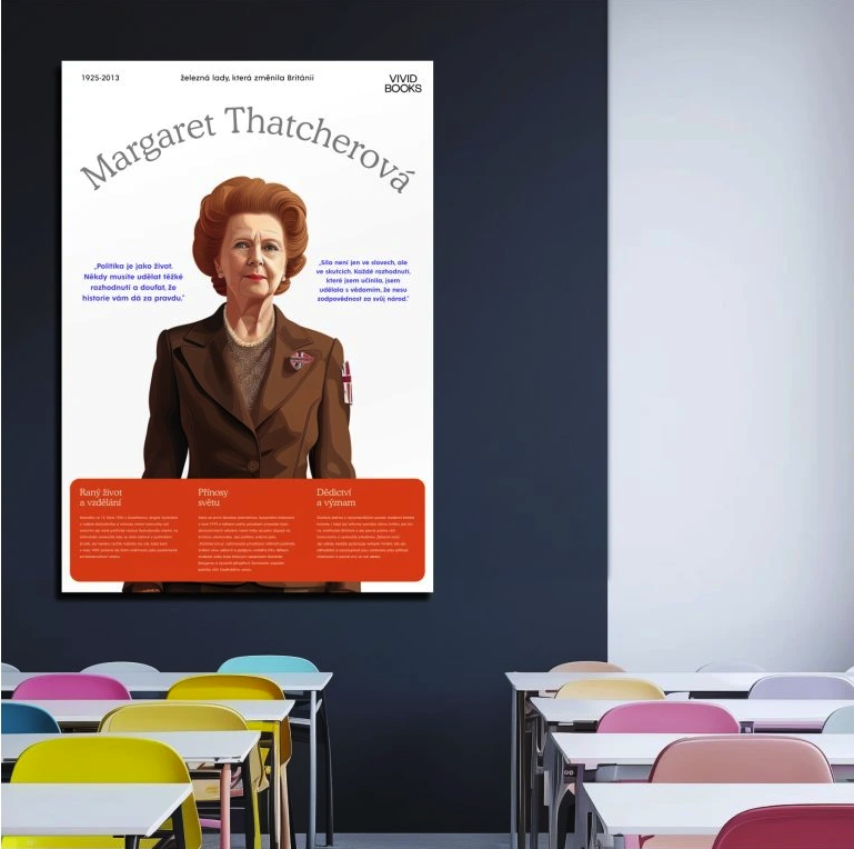 Plakát představuje Margaret Thatcherovou, přezdívanou „Železná lady“, která změnila Británii svým neústupným přístupem k politice a reformami. Byla první ženou na pozici premiéra Spojeného království, kde vedla zemi k hospodářským změnám a hrála klíčovou roli v globálním boji proti komunismu. Její odkaz inspiruje rozhodností, vizí a vírou v principy svobody a odpovědnosti.