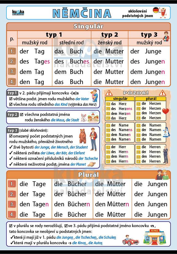 Nástěnný obraz pro výuku skloňování podstatných jmen v němčině (přehledné tabulky)