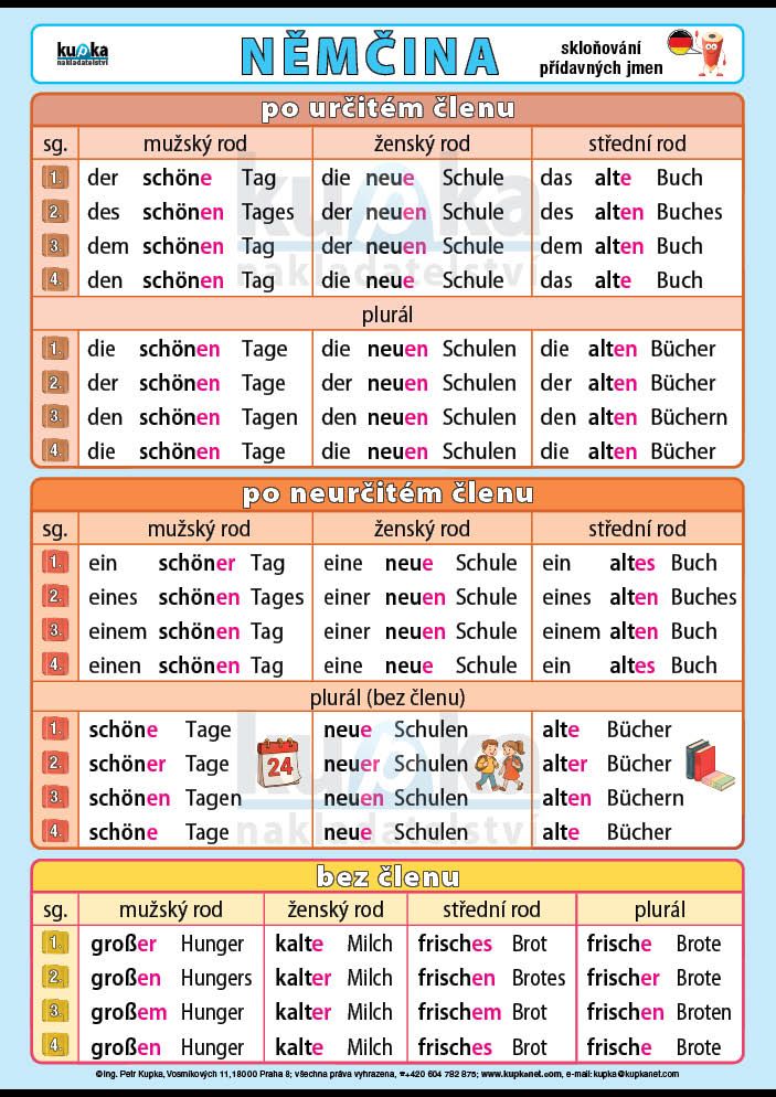 Nástěnný obraz pro výuku skloňování přídavných jmen v němčině (přehledné tabulky)
