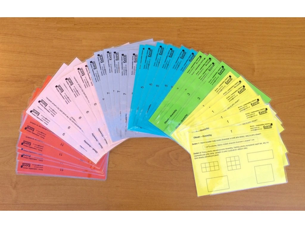 Další tři typy karet žáky krok za krokem vedou k pochopení výpočtu obsahu trojúhelníků, rovnoběžníků a lichoběžníků. Úkoly jsou koncipovány tak, aby žáci nejprve celý tvar pokryli plastovými dílky a následně jejich přesouváním převedli tvar na obdélník. Díky této praktické zkušenosti později lépe chápou i samotné vzorce – ve vzorci „vidí“ princip a logiku výpočtu.