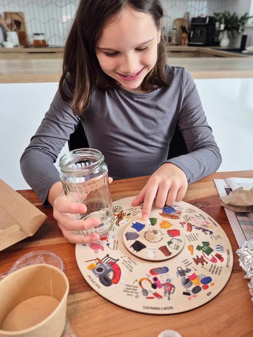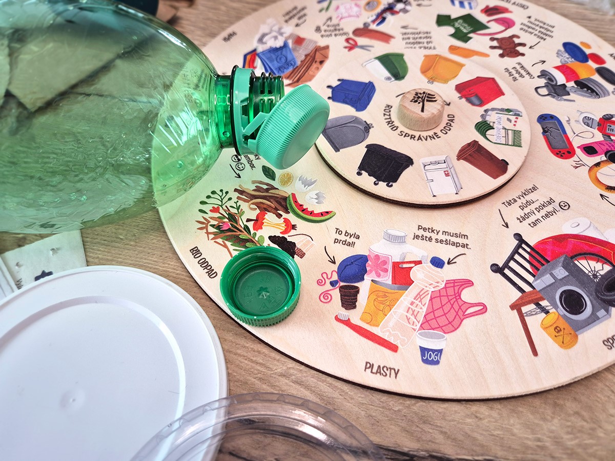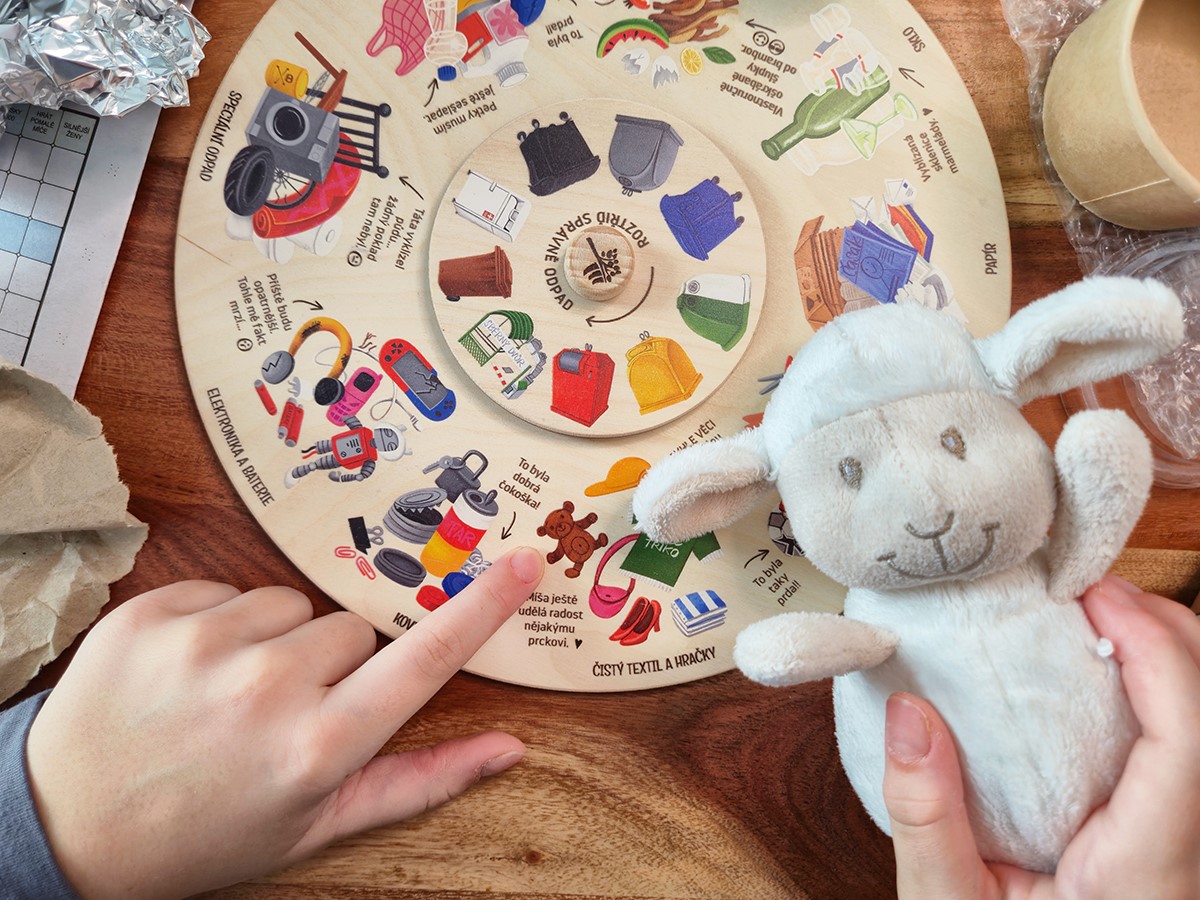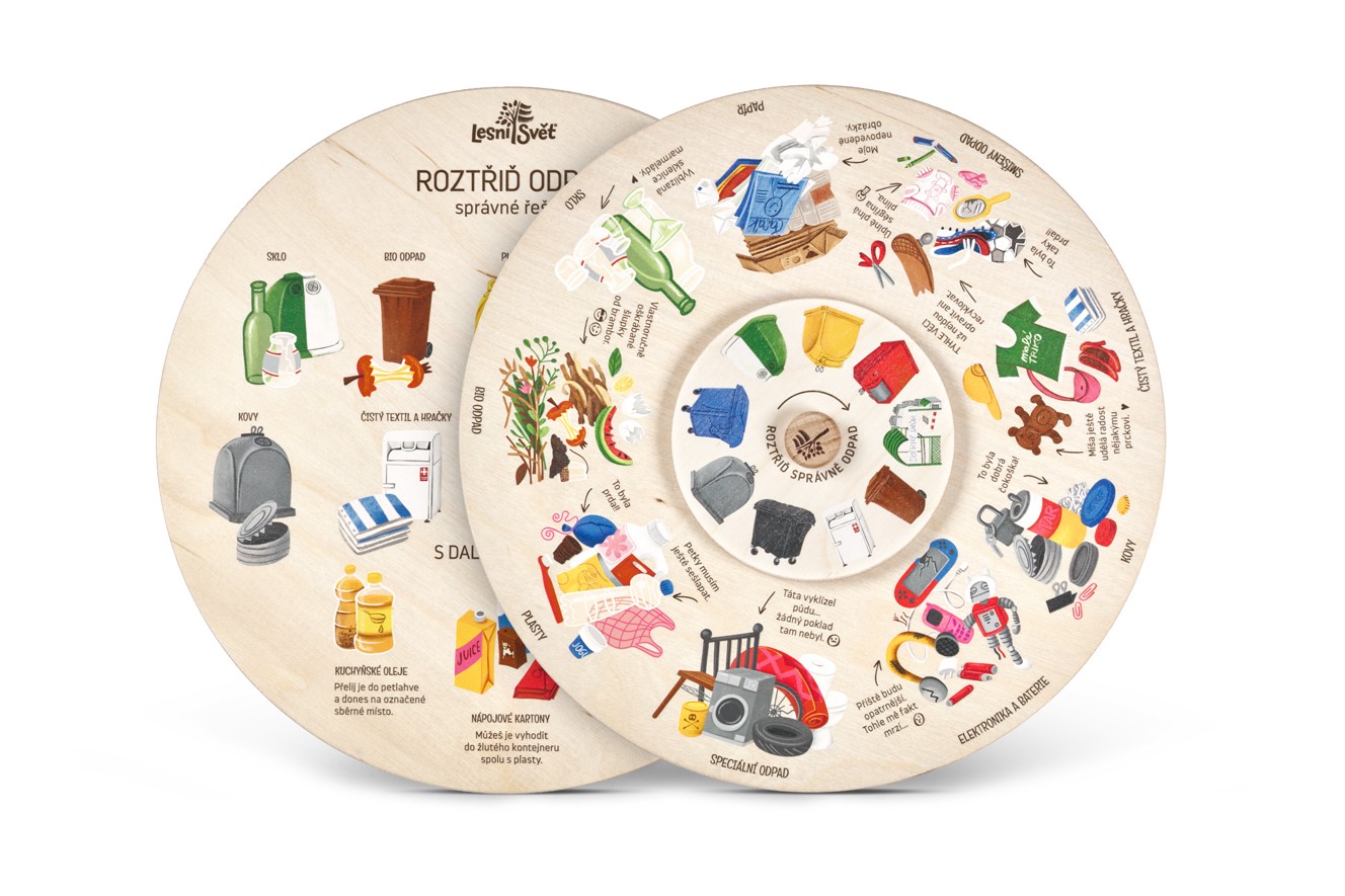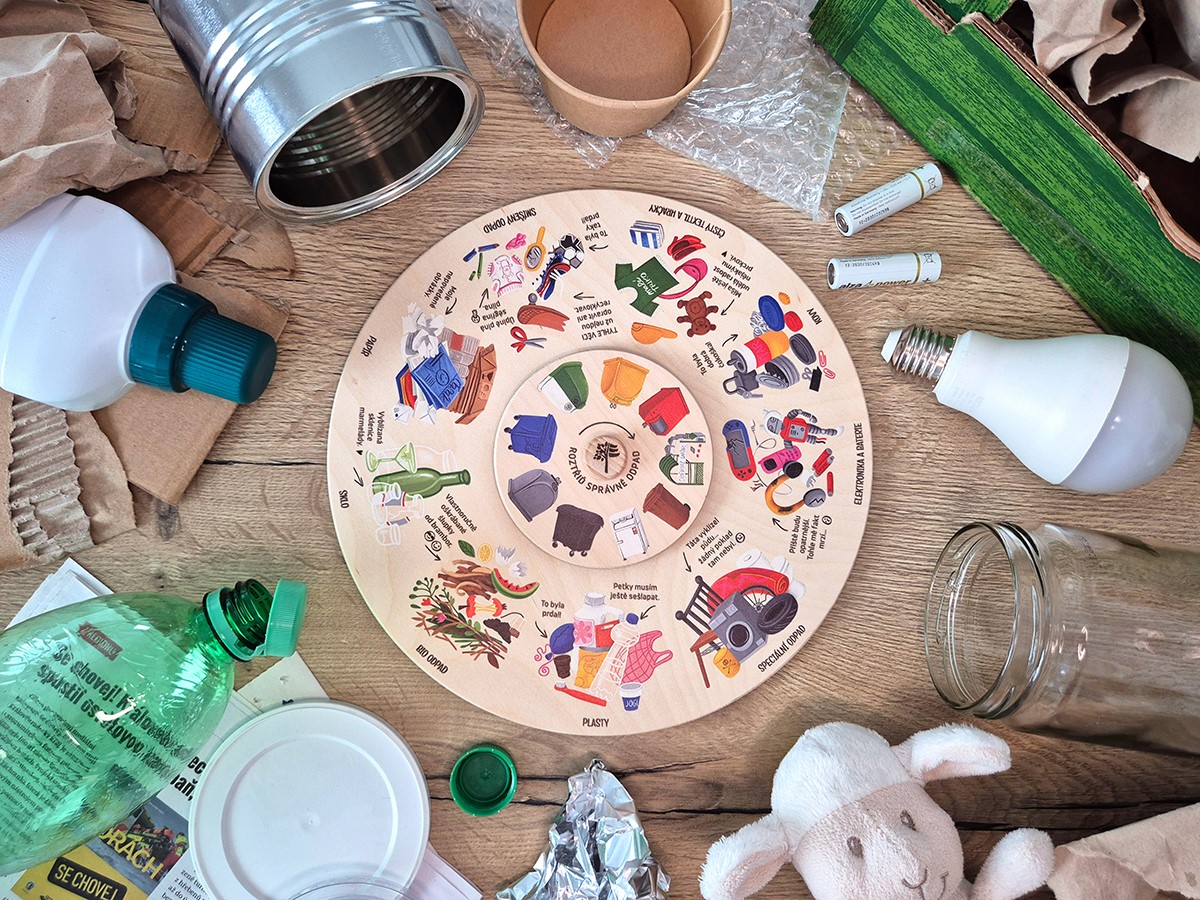 Úkol je jednoduchý a zábavný. Správným otočením kola přiřadíte odpadky do správné popelnice. Správné řešení je natištěné na zadní straně kola
