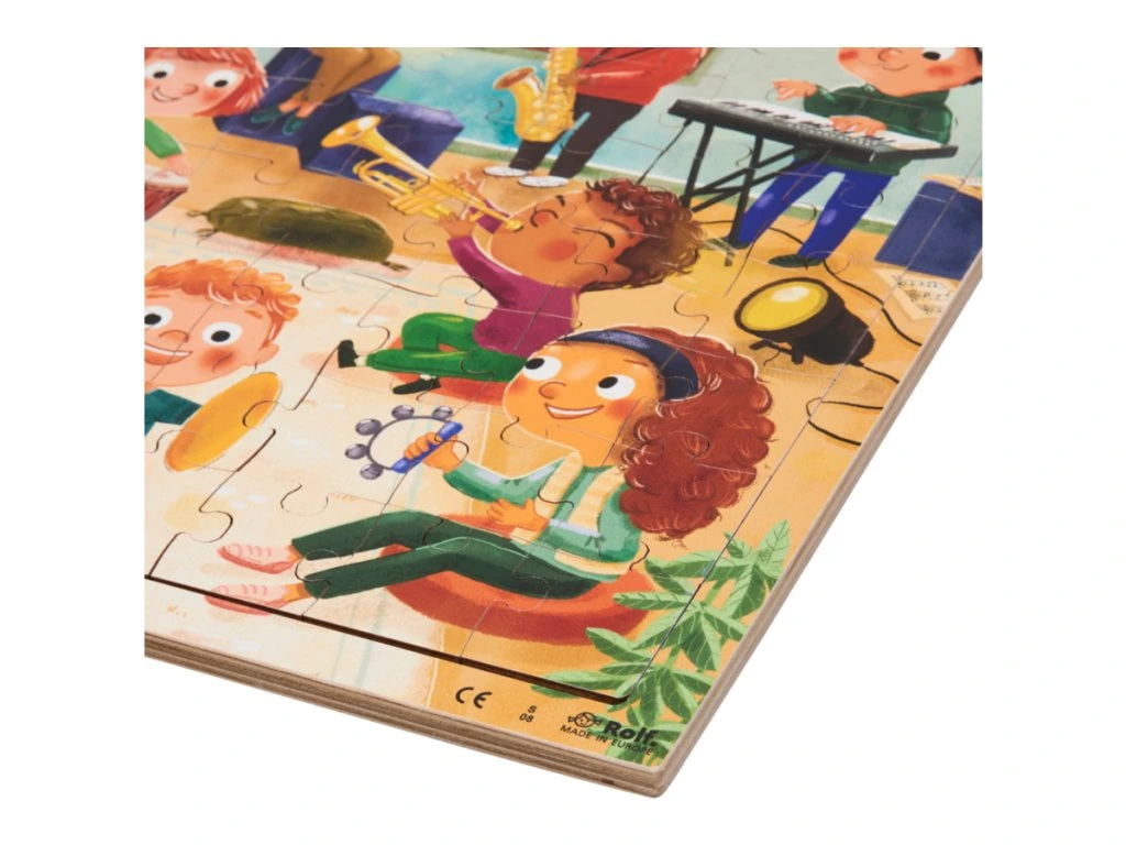 Hudební puzzle ukazuje děti s různými nástroji: kytara, klávesy, djembe, housle, saxofon, trubka, maracas, triangl, zvonek a činely.