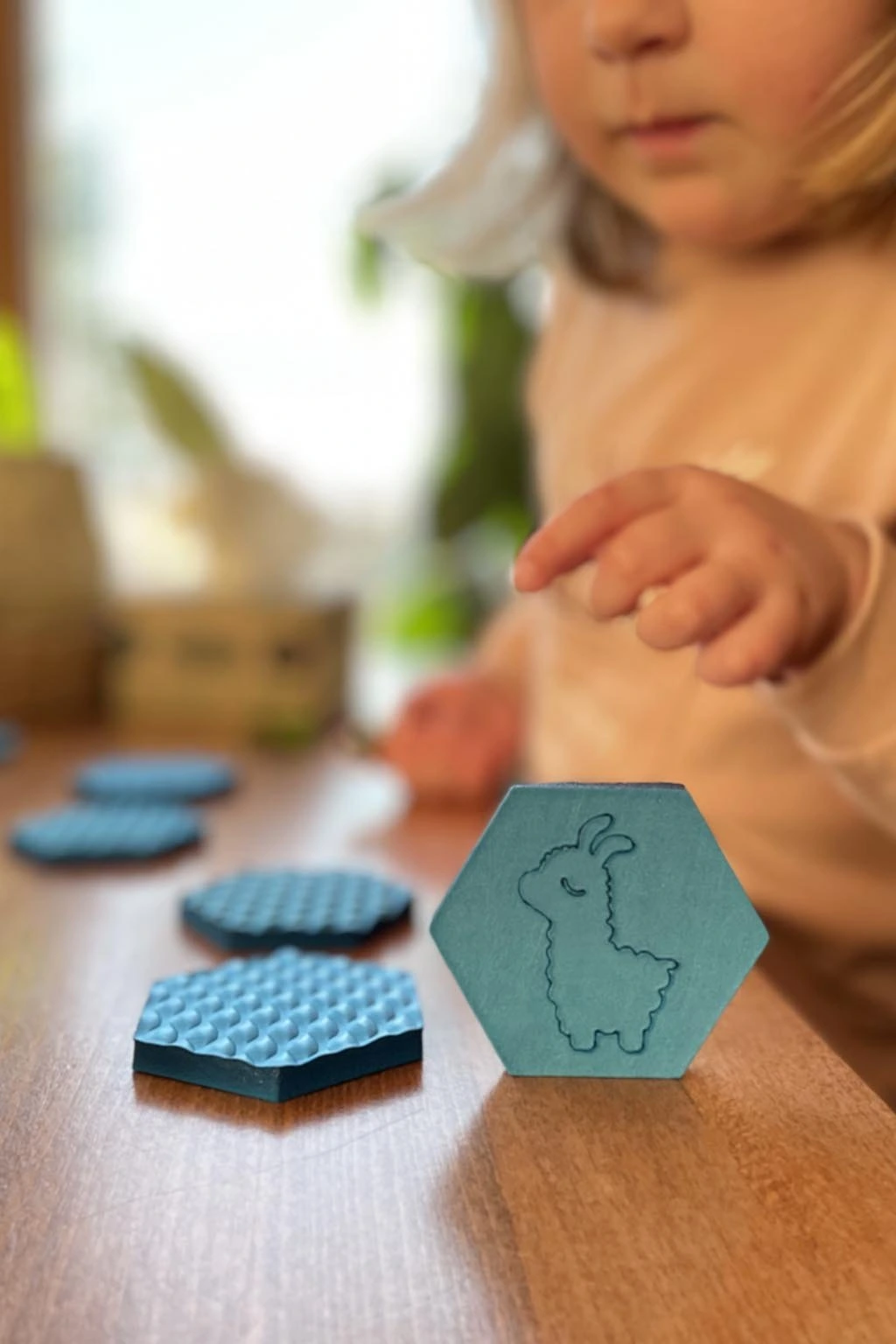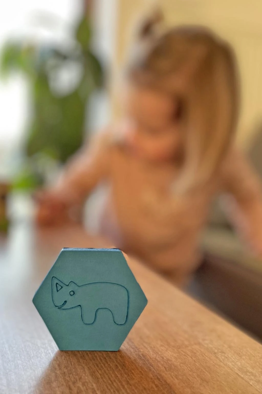 Sada obsahuje 10 párů zvířátek na pěnovém hexagonu (žralok, velryba, stegosaurus, brontosaurus, lama, slon, žirafa, krokodýl, krab a nosorožec).