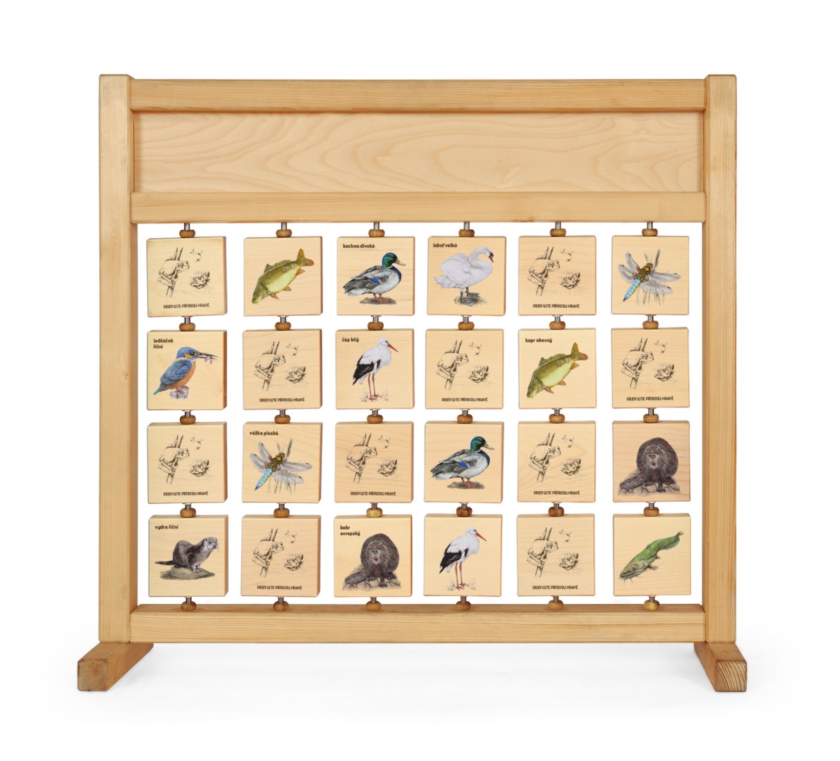 Na hrací desce najdete 24 otočných tabulek s nádhernými a věrně vyobrazenými kresbami zvířat u vody.