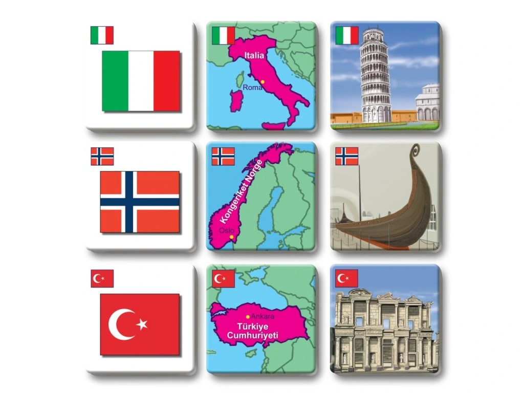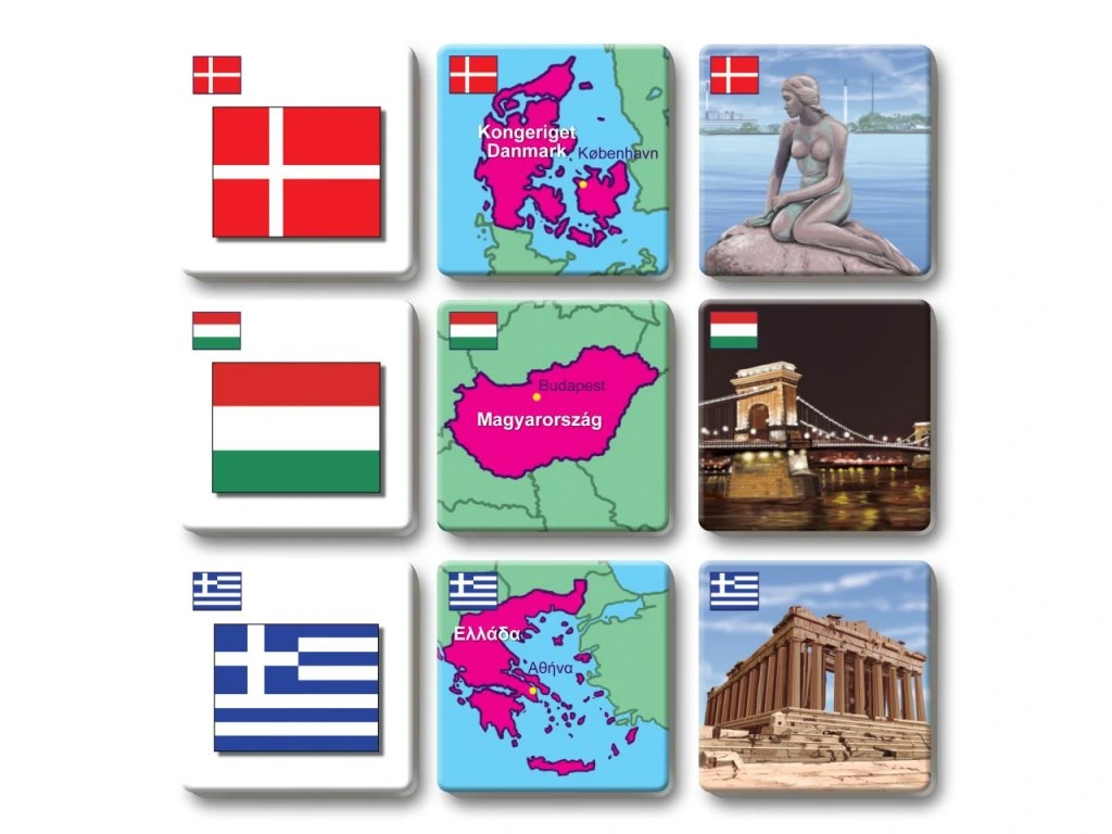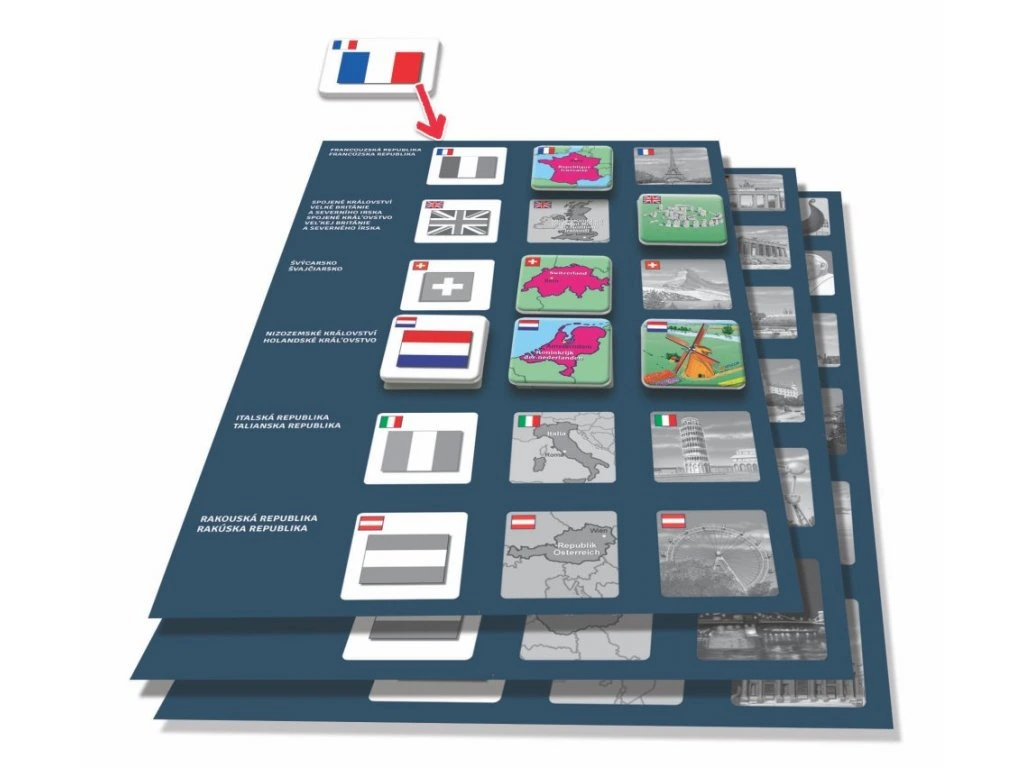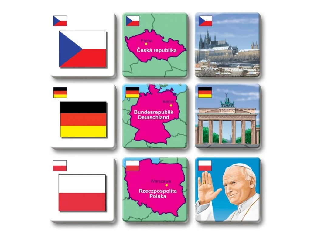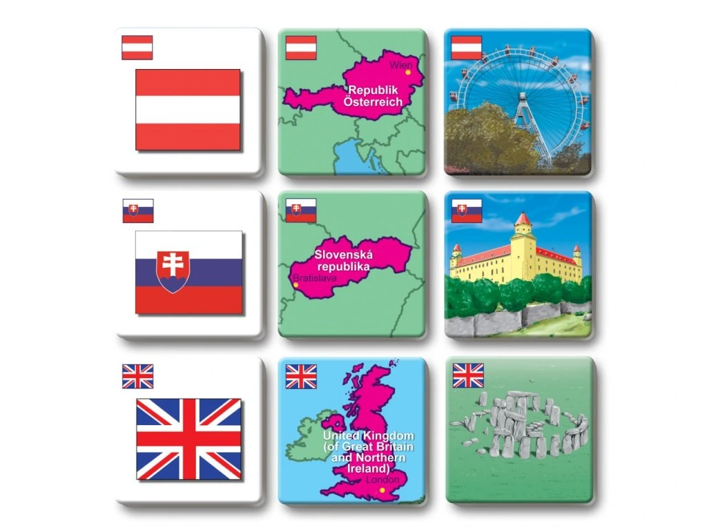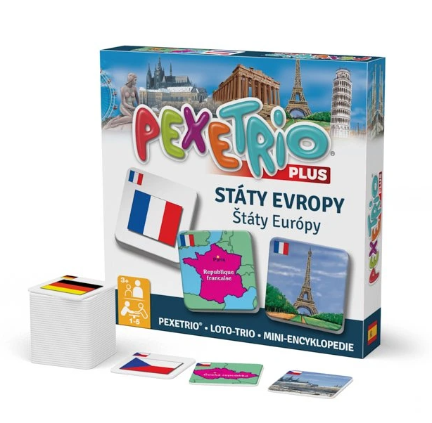 Pexetrio STÁTY EVROPY je zábavná hra inspirovaná pexesem, která děti zároveň i vzdělává. Děti se naučí vlajky, mapky a stavební památky daného státu podle hesla „škola hrou“.