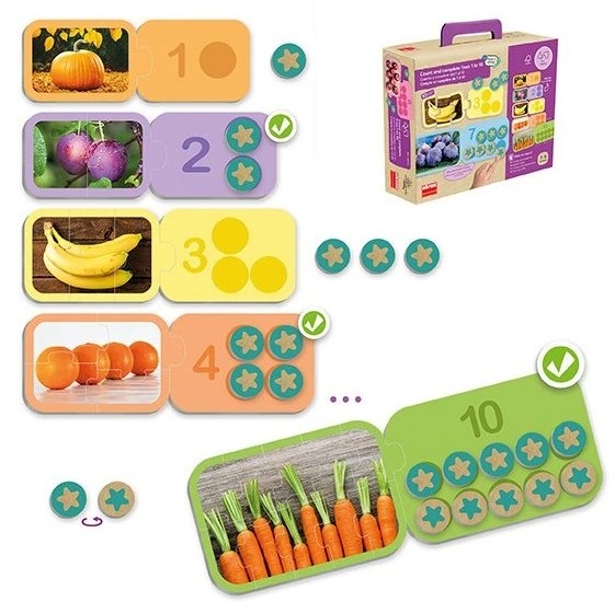 Tato vzdělávací hra "Počítej a doplň od 1 do 10" je ideální pro děti, které se učí počítat a rozpoznávat čísla. Sada obsahuje 10 progresivních puzzle desek (největší má rozměry 18 x 12 cm) a 60 kruhových kartiček o průměru 4 cm. Děti skládají puzzle, počítají prvky na obrázcích a přiřazují kuličky k odpovídajícímu číslu, čímž se učí počítat a vizuálně chápat rozklad čísel. Tato hra rovněž pomáhá s rozvojem jemné motoriky a koncentrace.