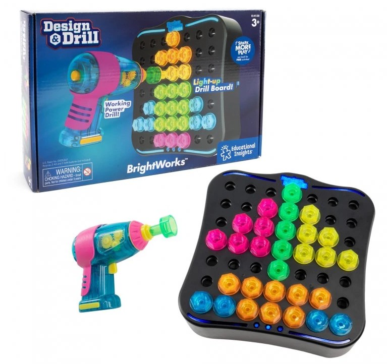 Oblíbená vrtací sada se šroubky v zářivých transparentních barvách a s vrtačkou bude bavit všechny děti. Vytvářejte mozaiky nebo obrázky podle fantazie nebo podle předloh. V desce jsou umístěná led světýlka díky kterým si můžete své dílko prosvítit.