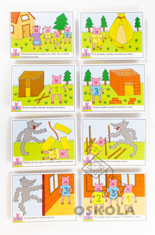 V sadě je celkem 6 pohádek, každá pohádka se skládá z osmi obrázkových kartiček, které jsou doplněny textem.