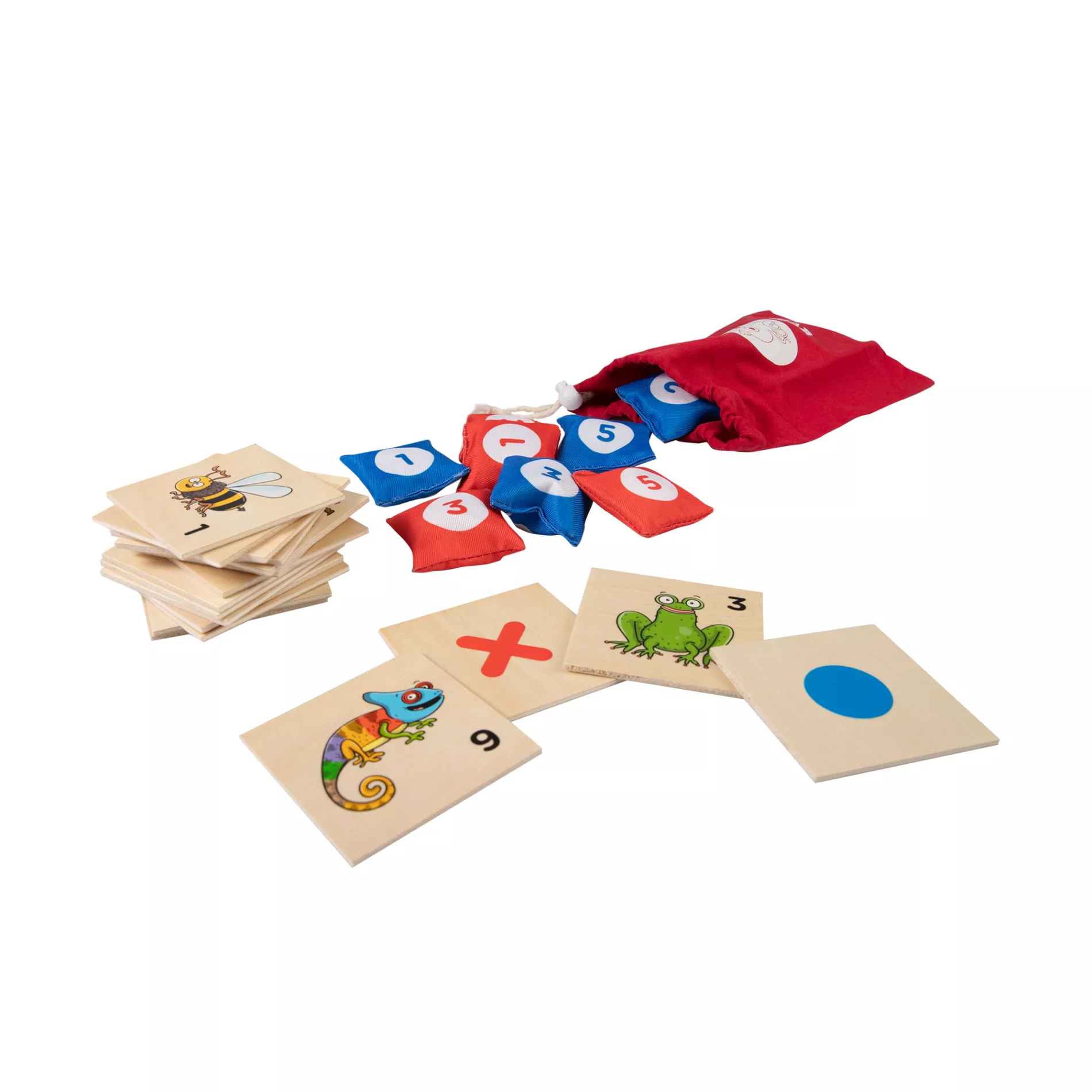 18 oboustranných dřevěných kartiček, 10 látkových házecích sáčků s čísly, textilní sáček pro snadné sbalení hry, návod na 10 aktivit.