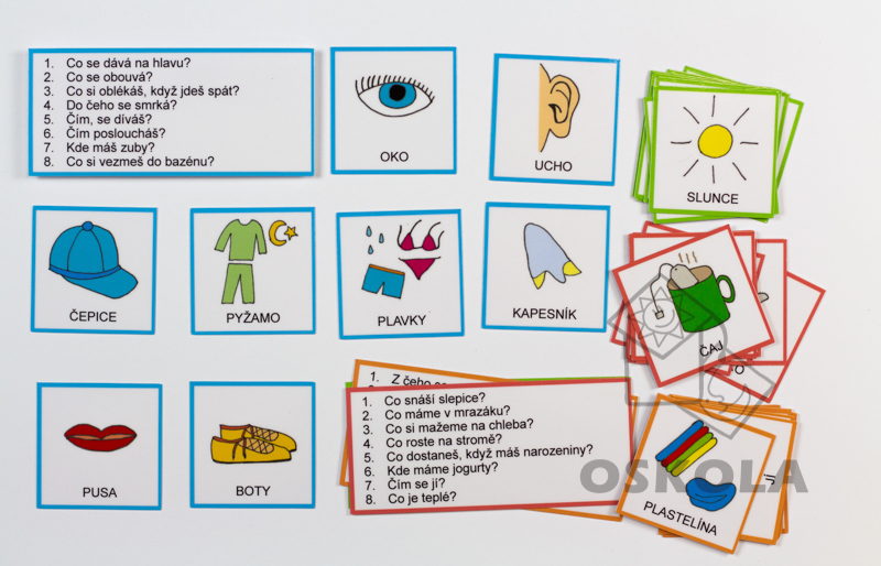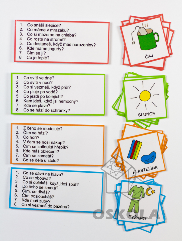 Sada obsahuje 4 barevně odlišené předlohy s otázkami a ke každé z nich 8 barevně odlišených kartiček s piktogramem, které slouží k odpovědi.