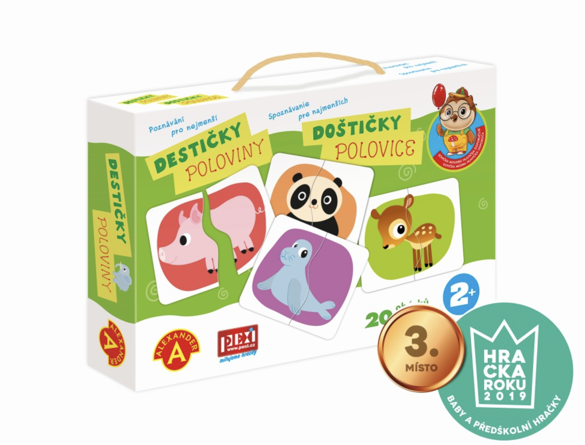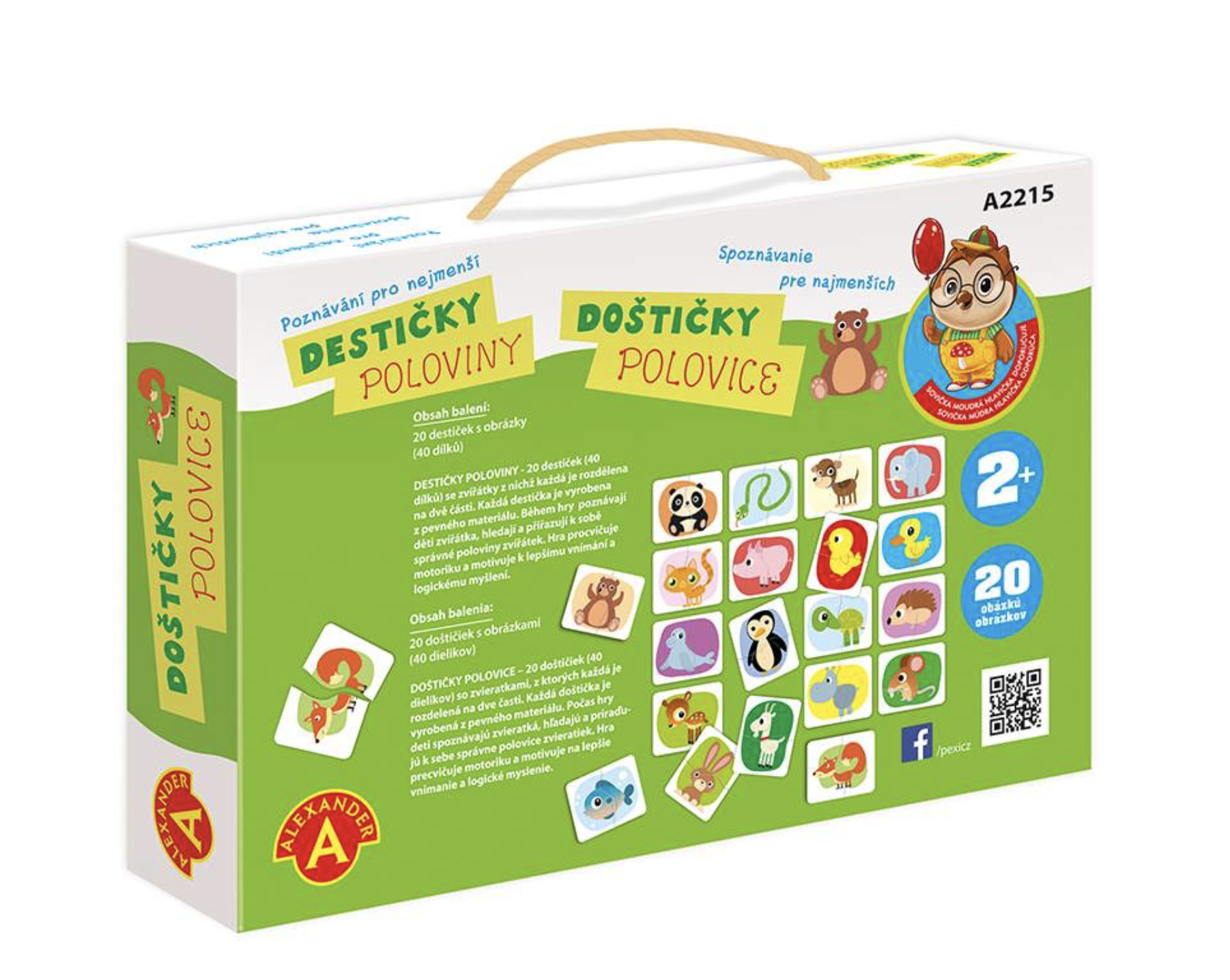 Jednoduchá, poznávací a naučná hra, která rozvíjí schopnosti dětí. Hra ze série "Sovička moudrá hlavička". Hra je zaměřená na rozvoj logiky, hmatu a poznávání barev. Díky zjednodušeným obrázkům se děti seznamují s novými slovy a rozšiřují si tak slovní zásobu. Principem hry je správně přiřadit správné poloviny zvířátek. Hra procvičuje motoriku a motivuje k lepšímu vnímání a logickému myšlení. Garantem poznávacích her je uznávaná psycholožka z varšavské univerzity Alexandra Petrovská. Hra je vhodná pro děti od 2 do 3 let. Obsah balení: 20 destiček s obrázky z pevného kartonu (40 dílků), Český a slovenský návod ke hře, pevnou krabici s uchem pro snadné přenášení.
