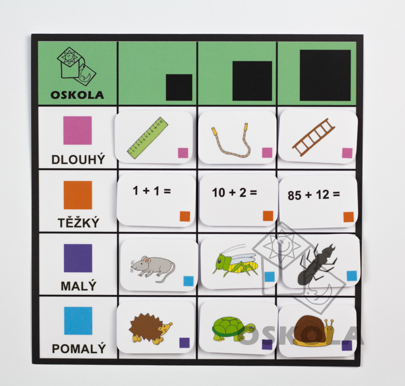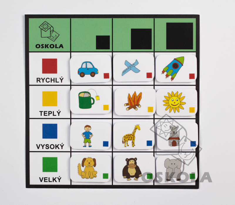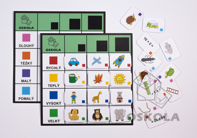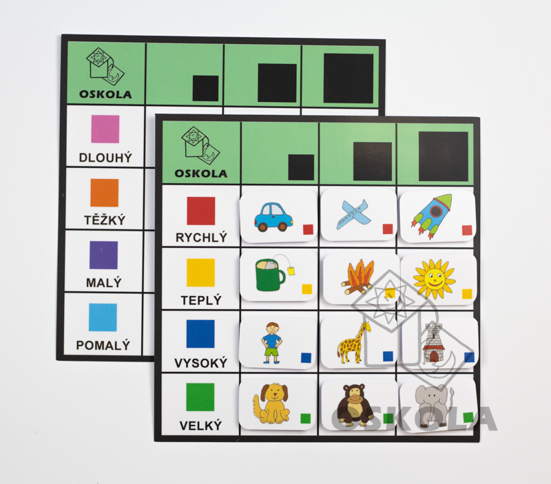 Úkolem je správně přiřadit malé kartičky s obrázky dle logiky a vytvořit věty s užitím přídavných jmen.