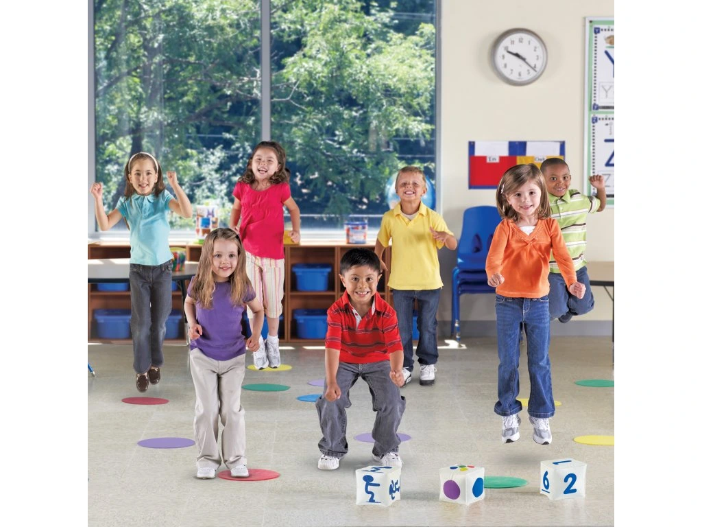 Rozprostřete po třídě nebo tělocvičně přiložené barevné disky. Stačí hodit kostkami a podle toho, co padne plňte pohybové úkoly. Na jedné kostičce je naznačený typ pohybu, který se má provést (např. skok...), na druhé počet opakování nebo počet disků , přes které by se mělo skočit a poslední ukáže barvu, na které by se mělo nakonec zůstat stát. Ale samozřejmě možností je spoustu a je jen na Vás, jak si poradíte a nakombinujete vlastní pravidla. Zábavná hra, která rozvíjí hrubou motoriku dětí, trénuje barvičky a počty.