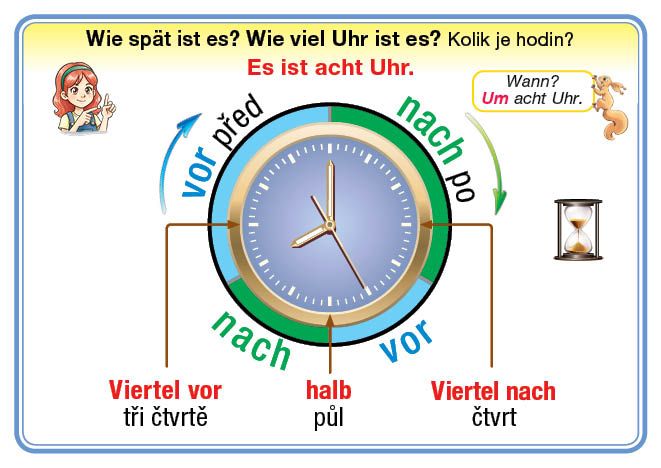 24 oboustranných karet na určování času v němčině.