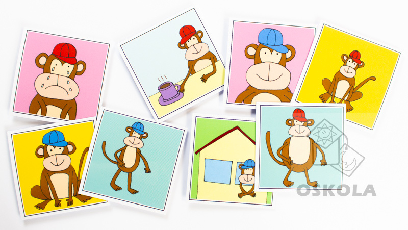 Soubor devíti dvojic karet, kde opičky znázorňují protikladná slova: veselý-smutný, malý-velký, prázdný-plný, studený-teplý aj.