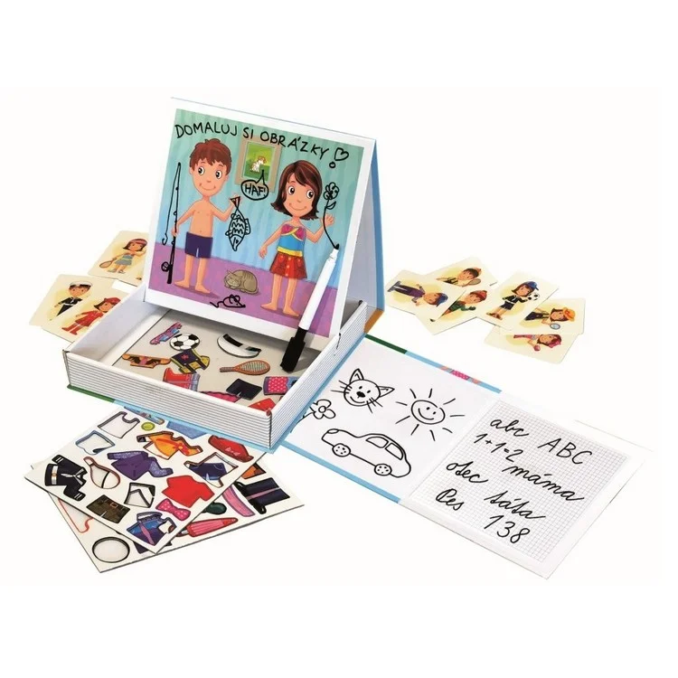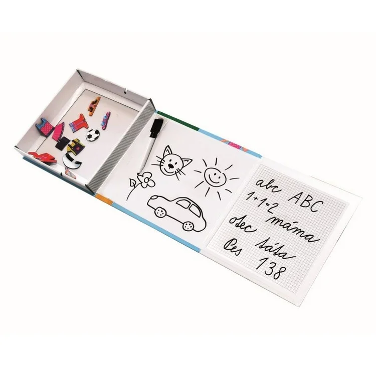 Skvělý trénink psaní písmenek, čísel a spousta volné plochy na malování mazací fixkou a skládání scének z magnetických obrázků.