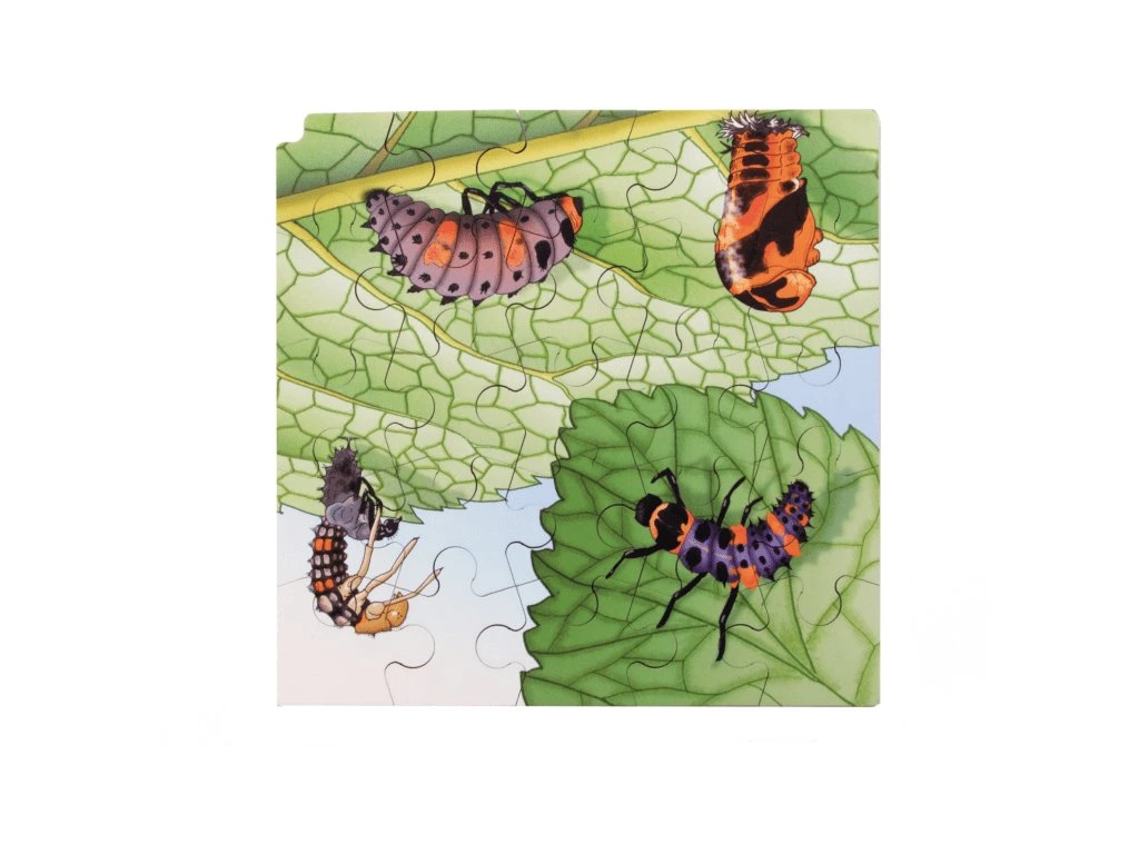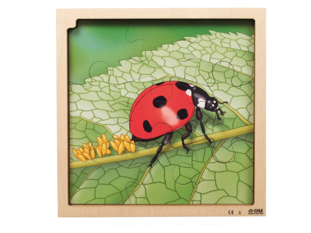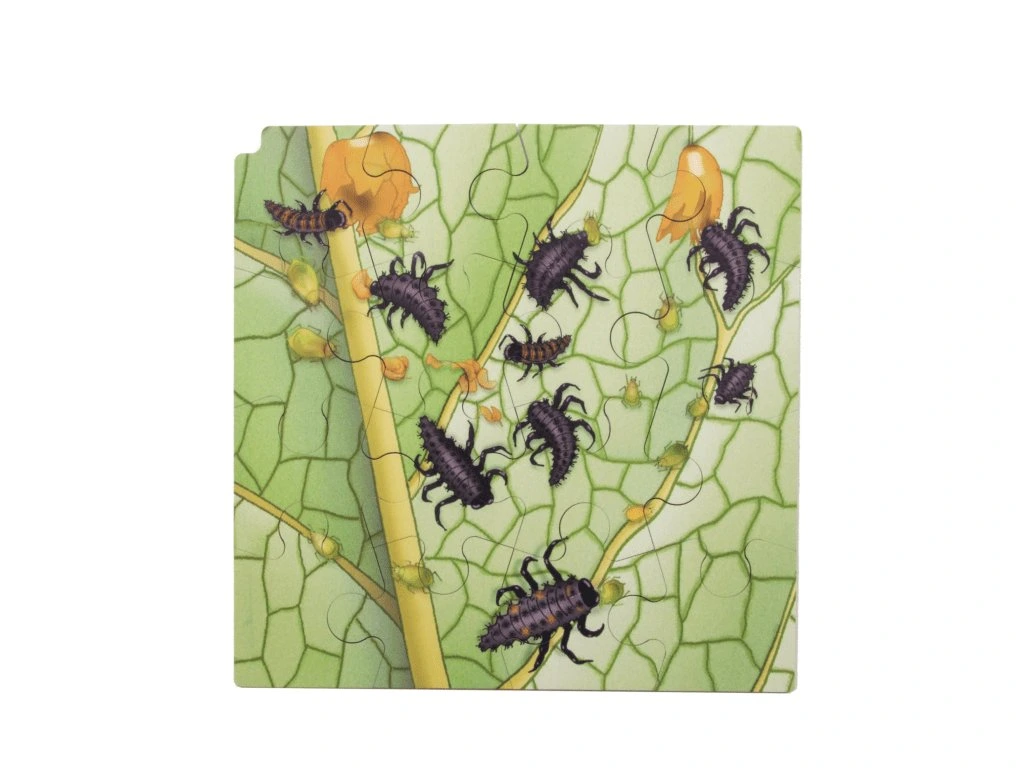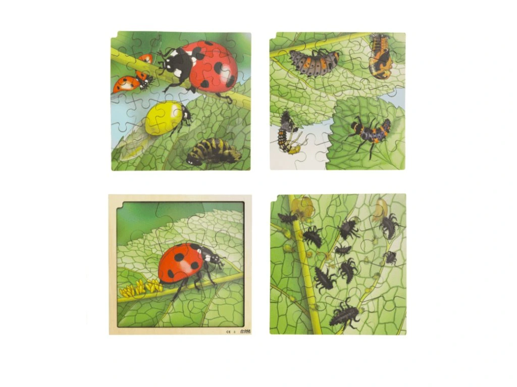 Krásné celodřevěné vývojové puzzle, které názorně ukazuje životní cyklus berušky od housenky až po berušku.