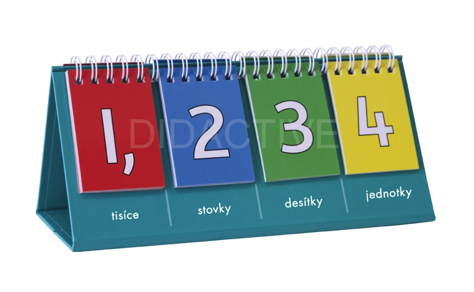 Počítadlo s "kalendářovou" konstrukcí o rozměru 21x9cm s jednotkami, desítkami, stovkami a tisícovkami. Barvy odpovídají sadě pro rozklad čísla v desítkové soustavě (č. 15190).