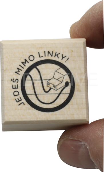 Motivační razítko ve formě dopravní značky v dřevěném provedení s textem „Jedeš mimo linky“.