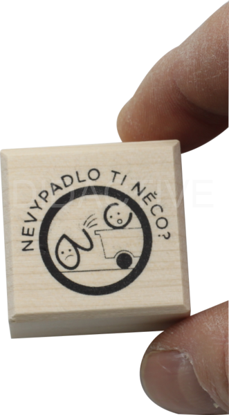 Motivační razítko ve formě dopravní značky v dřevěném provedení s textem „Nevypadlo ti něco“.
