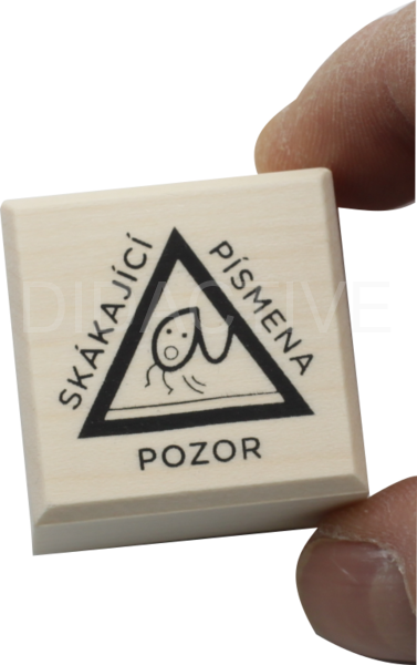 Motivační razítko ve formě dopravní značky v dřevěném provedení s textem „Pozor skákající písmena“.
