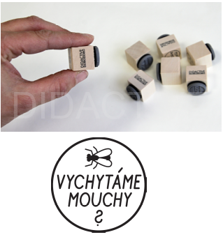 Motivační razítko v dřevěném provedení s textem „Vychytáme mouchy“. Ideální pro hodnocení žáků a zpětnou vazbu.