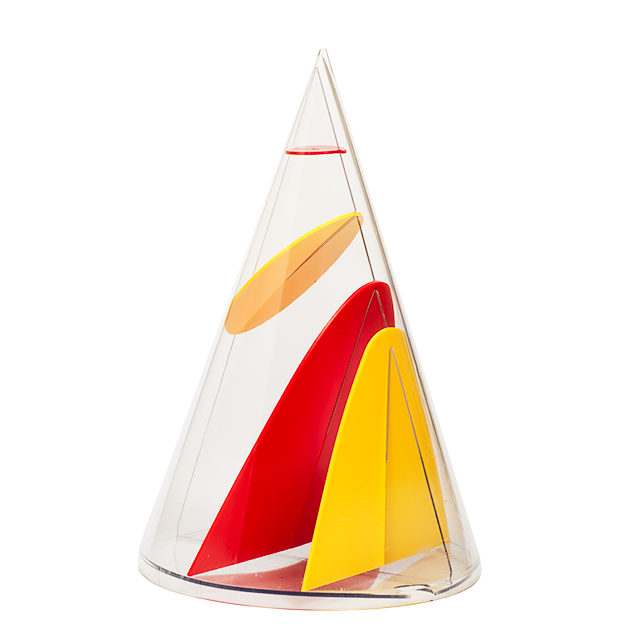 Kužel z transparentního plastu obahuje čtyři různobarevné kuželosečky: kružnici, elipsu, parabolu a hyperbolu.