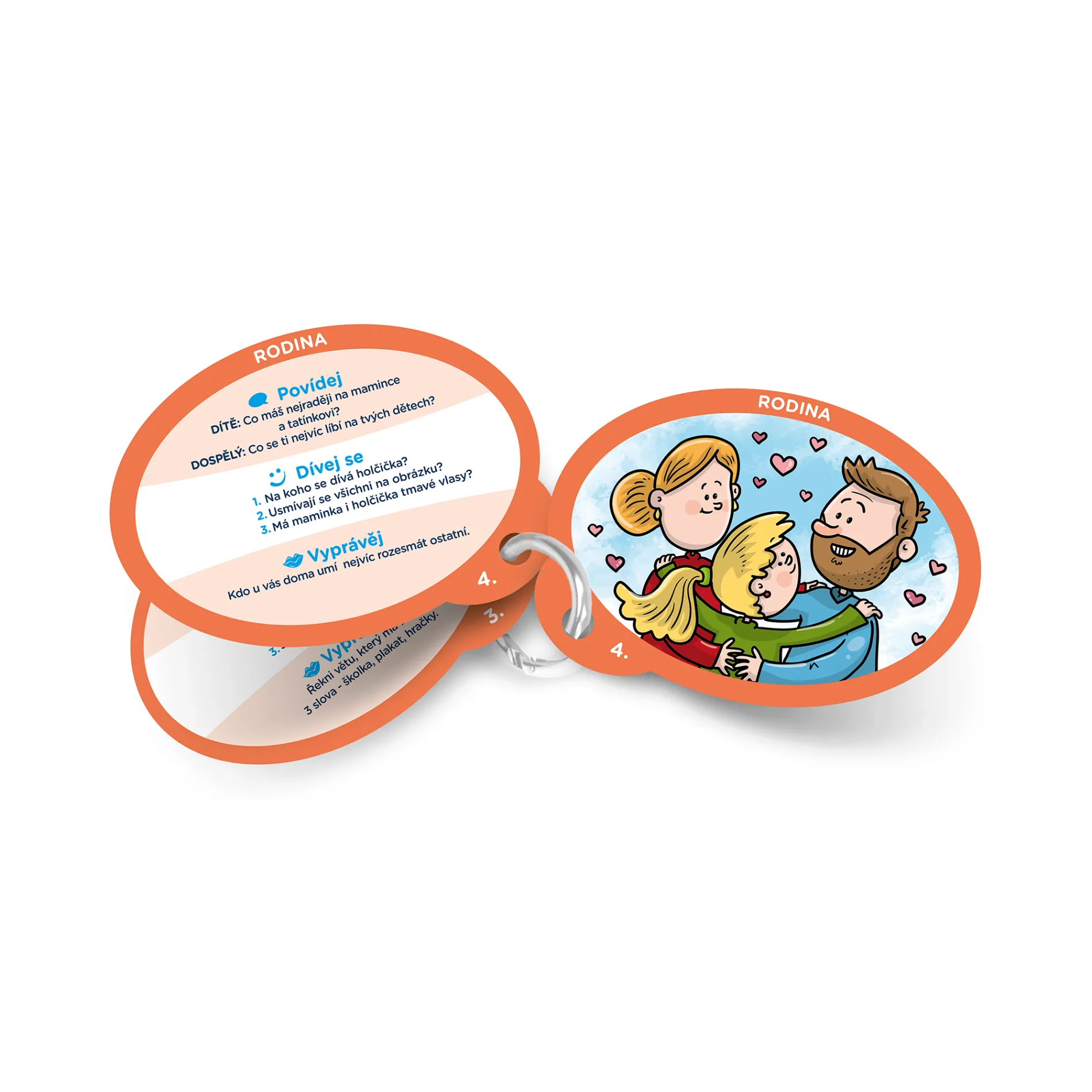 Na 40 oboustranných obrázkových kartách najdete 200 otázek, které slouží k otevřenému a důvěrnému povídání v rodině, vzájemnému poznávání, trénování postřehu, vyprávění a výzvám.