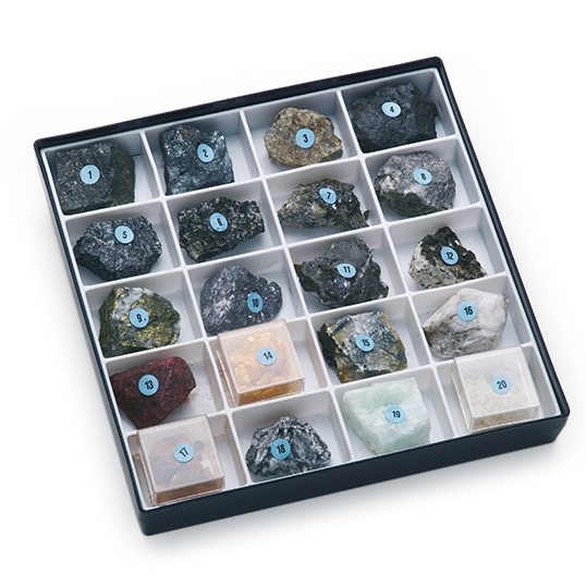 Sada rudní suroviny obsahuje 20 kusů základních minerálů, které se využívají jako přírodní suroviny pro výrobu kovů.