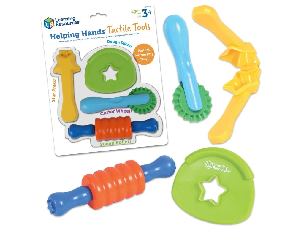 Tato senzoricky zaměřená sada obsahuje 4 hmatové pomůcky pro práci s modelínou nebo kinetickým pískem – uhlazujte je razítkovacím válečkem, vytvářejte tvary hvězdicovým lisem a navrhujte si vlastní tvary pomocí vykrajovátka. Tyto odolné a snadno čistitelné pomůcky jsou připraveny pro všechny druhy her jako součást senzorických stolů, sad pro tvoření a dalších kreativních aktivit.