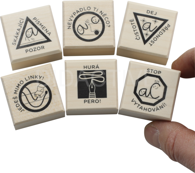 Motivační razítka ve formě dopravních značek v dřevěném provedení s texty: Hurá pero, Dej přednost čistotě, Nevypadlo ti něco?, Stop vytahování, Jedeš mimo linky, Pozor skákající písmena.