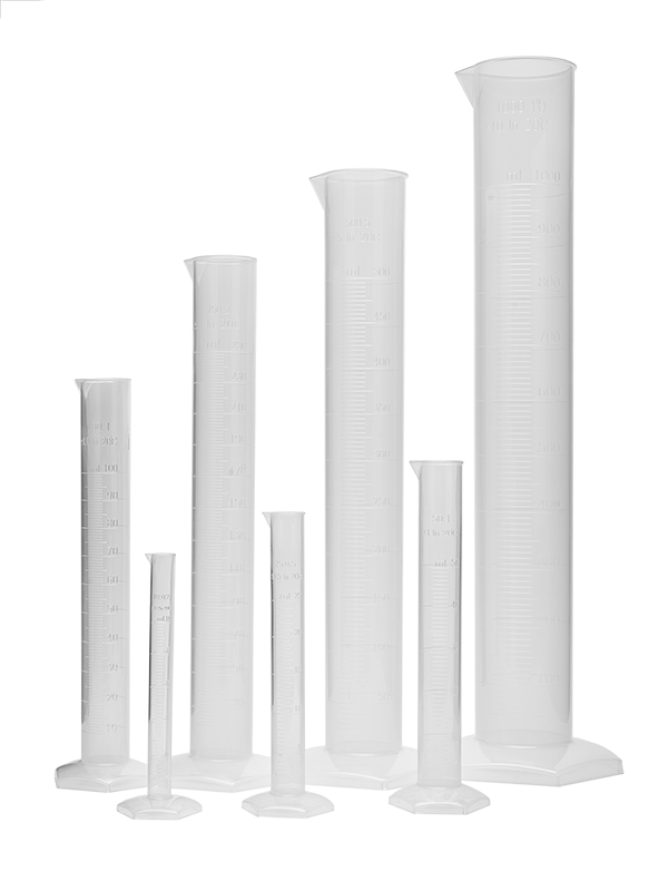 Sada plastových odměrných válců o objemu 1000 ml, 500 ml, 250 ml, 100 ml, 50 ml, 25 ml a 10 ml.