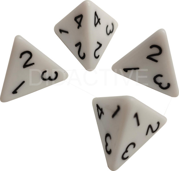 Sada obsahuje 4 bílé čtyřstěnné kostky (tetraedry) o velikosti přibližně 16 mm. Každá kostka je označena čísly 1 až 4. Na rozdíl od klasických šestistěnných kostek je u čtyřstěnných kostek hodnota určena číslem uvedeným u horního vrcholu, které je čitelné z každé strany – žáci tak snadno vidí výsledek hodu.