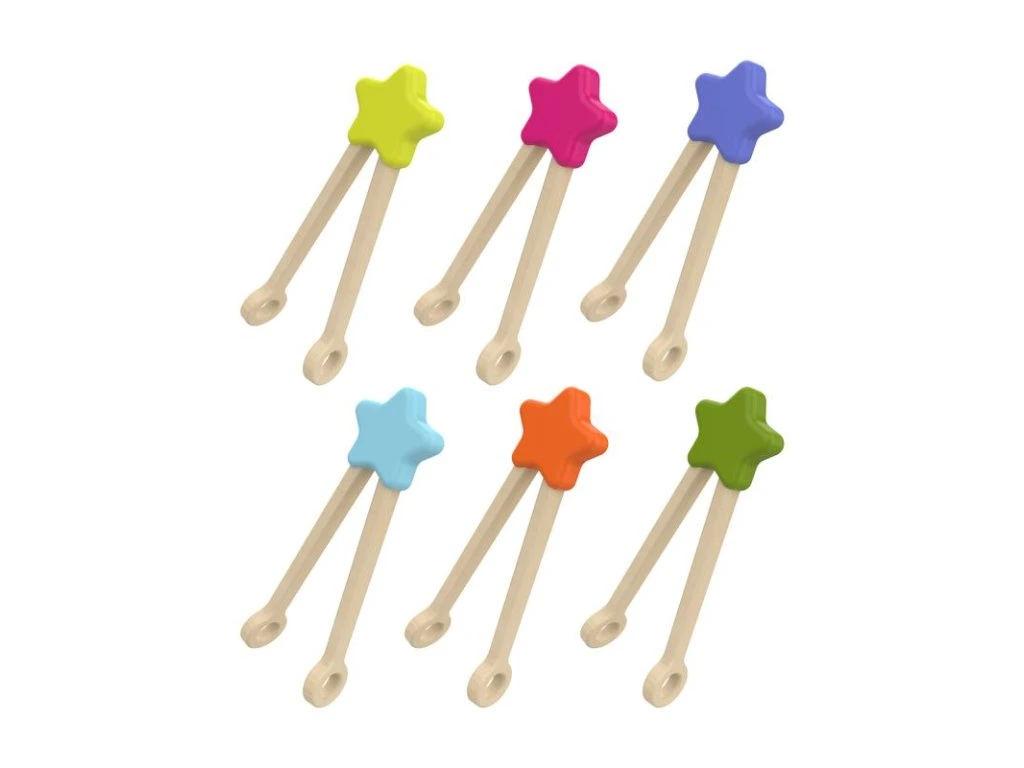 6 kusů dřevěných pinzet (délka 18 cm) v přírodním provedení s barevnými hvězdičkami.