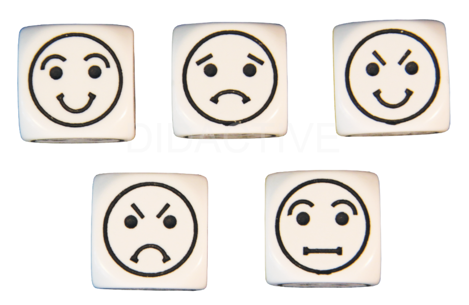 Sada se skládá z 5 bílých kostek o velikosti 16mm. Na každé kostce je šest různých schematických obličejů vyjadřijících emoce.