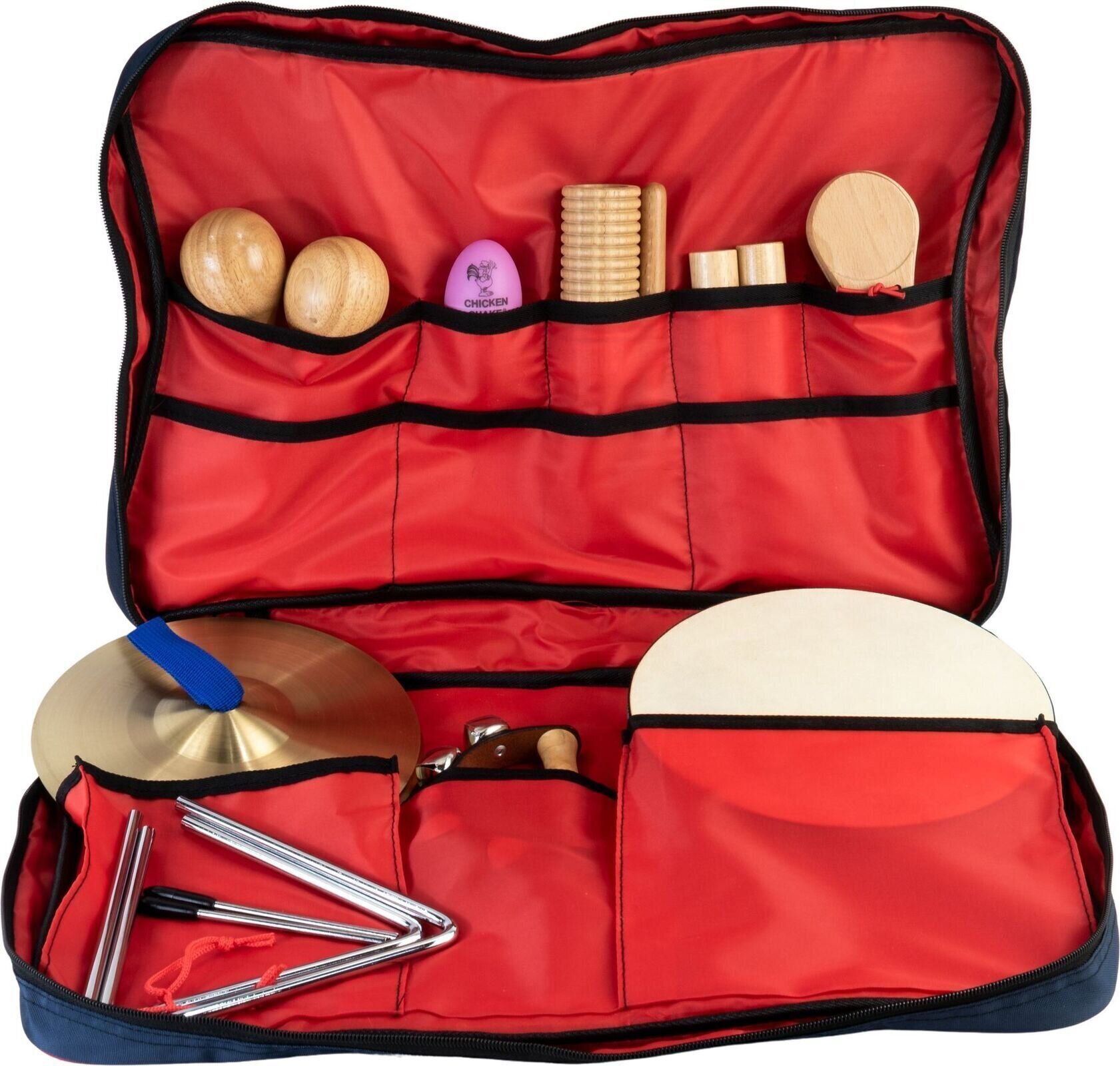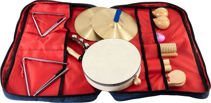 Obsahuje činely, maracas, triangle, claves, guiro, rolničky, kastaněty a rámový buben, vše balené v polstrované tašce.