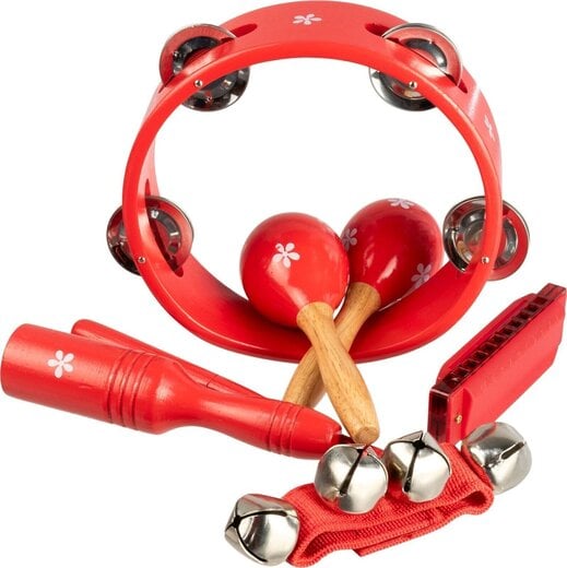 Obsahuje tamburínu bez blány, maracas, rolničky, wood block a plastovou ústní harmoniku.