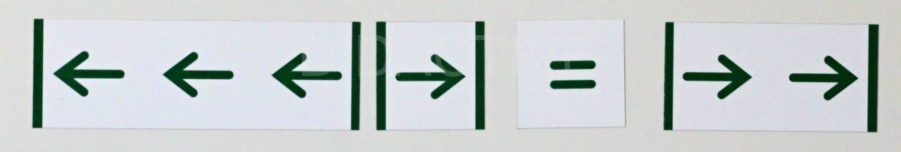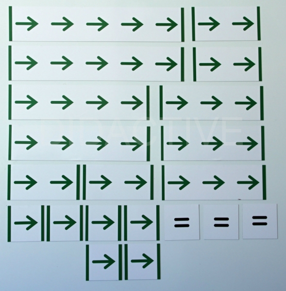 Dílky o rozměrech 6 x 6 až 6 x 30 cm jsou dostatečně velké a kontrastní (tmavě zelené šipky na bílém pozadí) pro dobrou viditelnost z jakéhokoliv místa ve třídě.