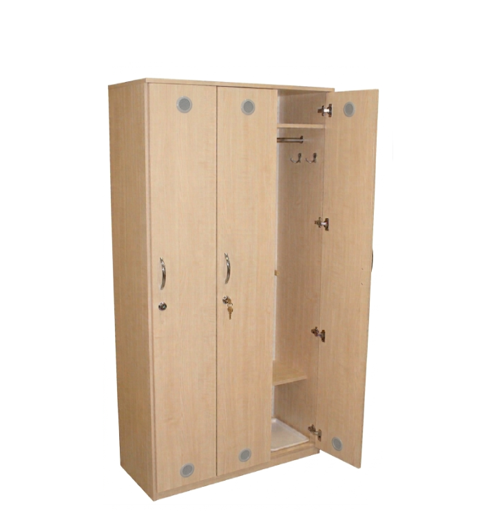 Šatní skříň dřevěná. Různé typy zámků. Horní i spodní odvětrání. Možnost generálního klíče pro otevření všech skříněk při variantě klasických nábytkových zámků. Za příplatek možnost barevných dvířek. Skříň je vyrobena z kvalitní oboustranně laminované dřevotřísky tl. 18 mm s ABS hranami. Spodní police je zkrácená, aby bylo možné ustavení i vysoké obuvi. Skříň je opatřena soklem a rektifikačními nožkami pro ustavení na nerovné podlaze. Záda jsou vyrobena z bílého sololaku, ale za příplatek je možné skříň opatřit pevnými zády z laminované dřevotřísky (pokud bude třeba skříň stát v prostoru a záda budou vidět). Kromě standardních zámků Vám umíme nabídnout a poradit s výběrem čipových zámků, kódových zámků, mincovných zámků atd. V případě zájmu Vám skříň vyrobíme jakkoli na míru.