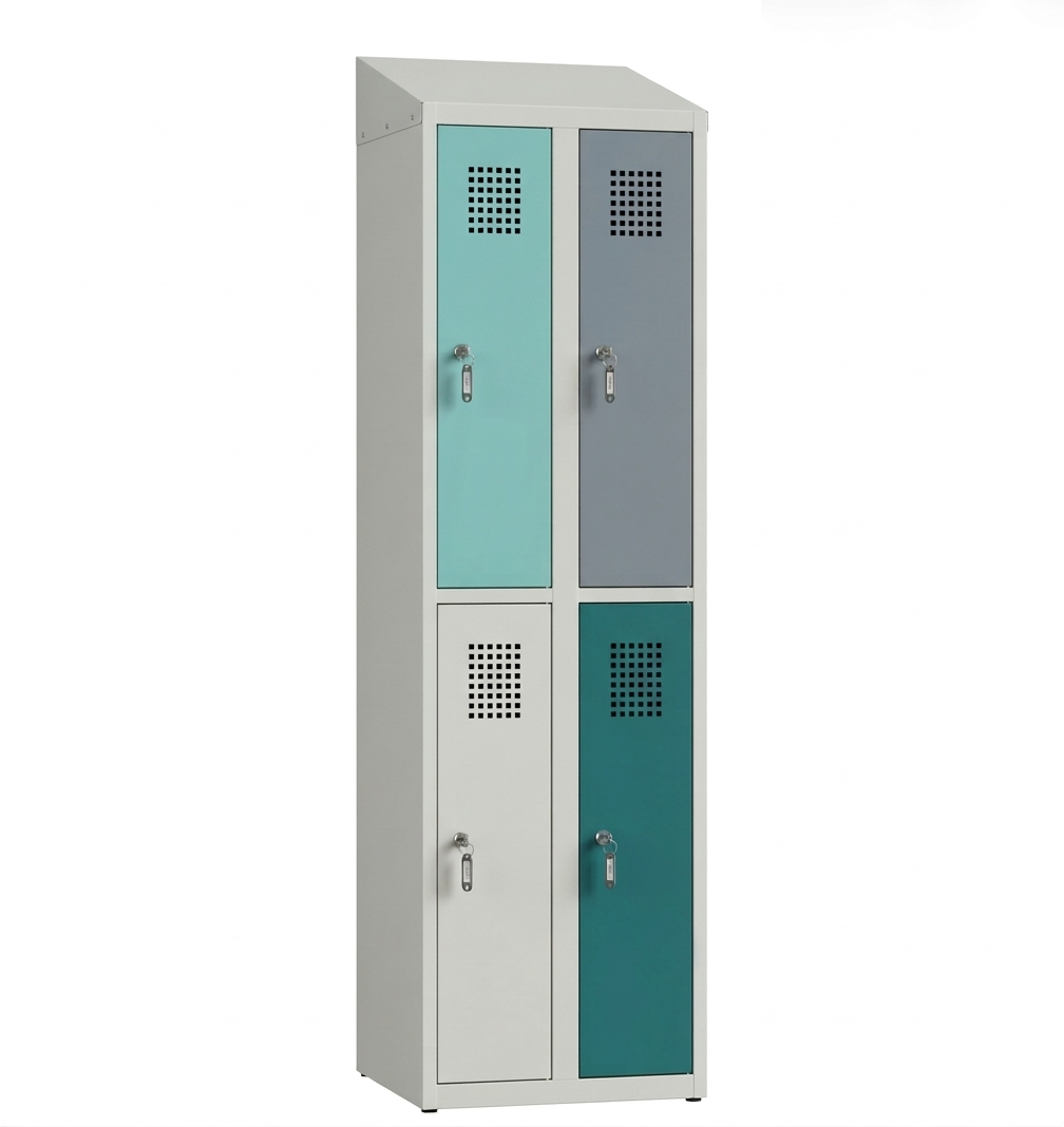Skříň se čtyřmi šatními oddíly. Výška 1850 x šířka 600 x hloubka 500 mm. Vyrobená z kvalitního plechu 0,75 mm silného. Celá skříň je opatřena žárově vypalovanou práškovou polyesterou barvou. Na přání umíme opatřit jakýmkoli typem a odstínem barvy. Větrací otvory ve dvířkách a v zádech skříňky.