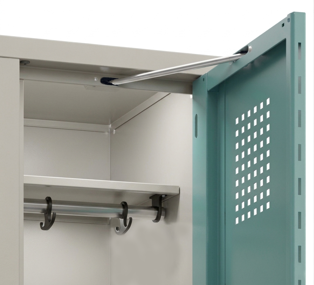 Každý oddíl je vybaven čtyřhranou kovovou šatní tyčí, která je uchycena na námi vyvinutém systému úchytů a je vybavena 2 ks kvalitními plastovými háčky tvaru kotvy s nosností neuvěřitelných 85 kg. Každá skříńka je také opatřena tzv. omezovačem otevření dvířek, což jednak chrání dvířka a také deifnuje prostor každého uživatele skříňky, kdy mu v jeho užívání skříňky nebrání přespříliš otevřená dvířka jeho souseda.
