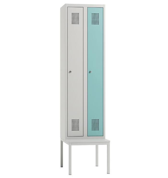 Skříň se dvěma šatními oddíly. Výška 2100 x šířka 600 x hloubka 500/810 mm. Vyrobená z kvalitního plechu 0,75 mm silného. Celá skříň je opatřena žárově vypalovanou práškovou polyesterou barvou. Na přání umíme opatřit jakýmkoli typem a odstínem barvy. Větrací otvory ve dvířkách a v zádech skříňky. Sedák předlavičky může být z laminované dřevotřísky nebo latí z masivu.