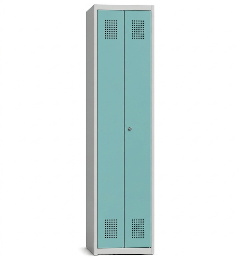 Skříň se dvěma šatními oddíly a dvoukřídlými dvířky na jeden zámek je převážně využívaná v provozech, kde uživatel musí oddělit osobní oblečení a obuv od toho pracovního. Díky dvoukřídlým dvířkům má tak do uvnitř oddělné skříně přístup na jeden zámek, který může být klasický na klíč, nebo třeba na kód nebo čip. Výška 1850 x šířka 600 x hloubka 500 mm. Vyrobená z kvalitního plechu 0,75 mm silného. Celá skříň je opatřena žárově vypalovanou práškovou polyesterou barvou. Na přání umíme opatřit jakýmkoli typem a odstínem barvy. Větrací otvory ve dvířkách a v zádech skříňky. Každý oddíl se dá ještě rozdělit napůl svislou příčkou.
