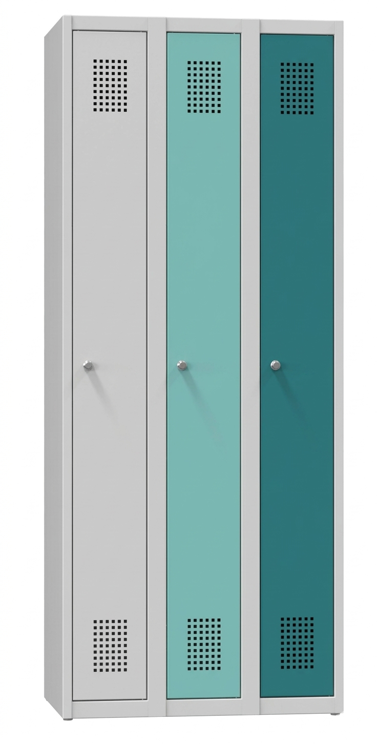 Skříň se třemi šatními oddíly. Výška 1850 x šířka 900 x hloubka 500 mm. Vyrobená z kvalitního plechu 0,75 mm silného. Celá skříň je opatřena žárově vypalovanou práškovou polyesterou barvou. Na přání umíme opatřit jakýmkoli typem a odstínem barvy. Větrací otvory ve dvířkách a v zádech skříňky.