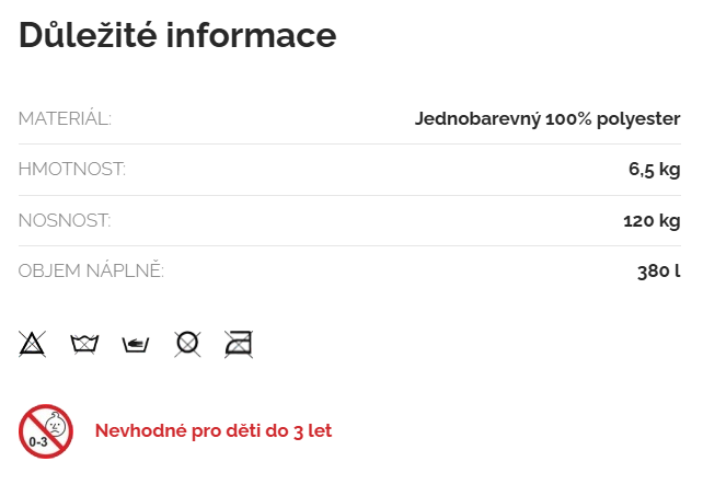 Před všetečnými a zvídavými dětmi je otvor zabezpečený dvojím zipem a schovaným jezdcem. Samotná EPS náplň je potravinářské kvality, zdravotně nezávadná s certifikací a kuličky jsou dostatečně husté a malé, aby nedocházelo k rychlému sesednutí. Pokud se v našem e-shopu registrujete, dokoupíte vždy EPS náplně výhodněji.