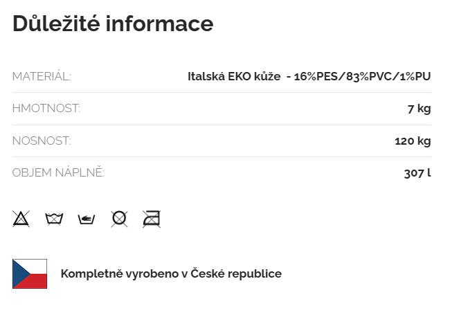 Jednovrstvý sedací vak (nemá dodatečný vnitřní obal). Ušitý je z vysoce kvalitní látky nenáročné na údržbu – nečistoty jednoduše odstraníte vlhkou houbičkou s mýdlovou vodou. Vak má dvojité švy, které zajišťují vysokou odolnost a dlouhou životnost. Luxusní italská eko kůže je vyrobena v souladu s ekologickými předpisy EU a neobsahuje AZO barviva. Materiál nejvyšší kvality atestovaný na odolnost trhání, otěru, oděru, plísním a proti opakovanému ohybu.
