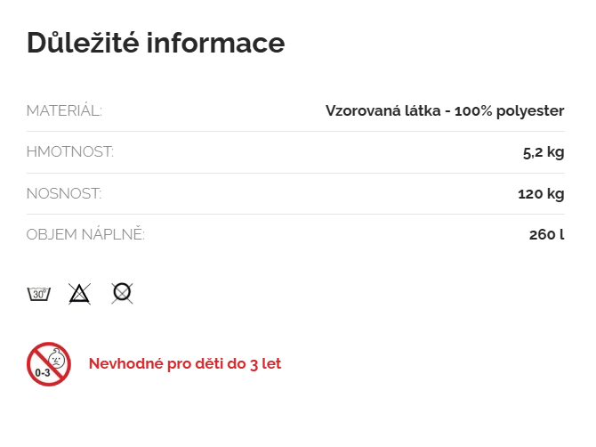 Dvouvrstvý sedací vak se samostatným vnitřním obalem. Vysoce kvalitní polyesterová látka je nenáročná na údržbu. Obal lze z vaku sundat a vyprat v pračce.